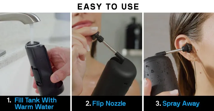 • Triple spray design – water is directed towards walls of ear canal to loosen and clear ear wax