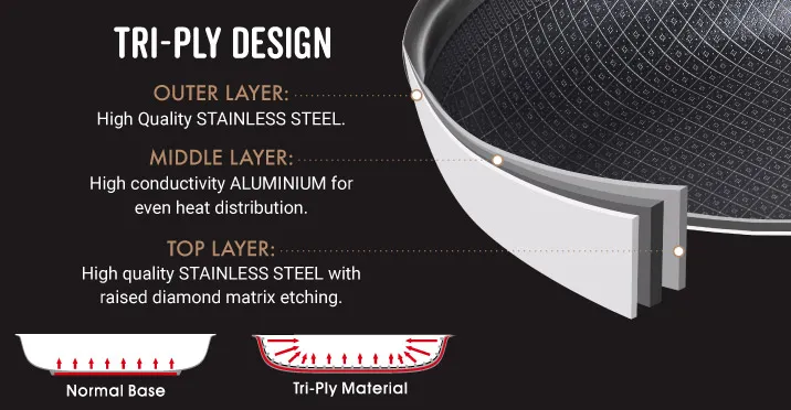 - Tri-Ply design has 3 layers of bonded metal - aluminium for fast conduction between two layers of stainless steel for even cooking and heat retention