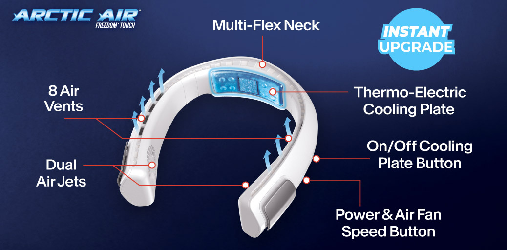 Freedom Touch has 3 air speed settings – low, medium, or high. Simply press the power button to set the speed. Plus you can turn off/on the Thermo-Electric Cooling Plate which provides additional cooling comfort at the back of your neck.