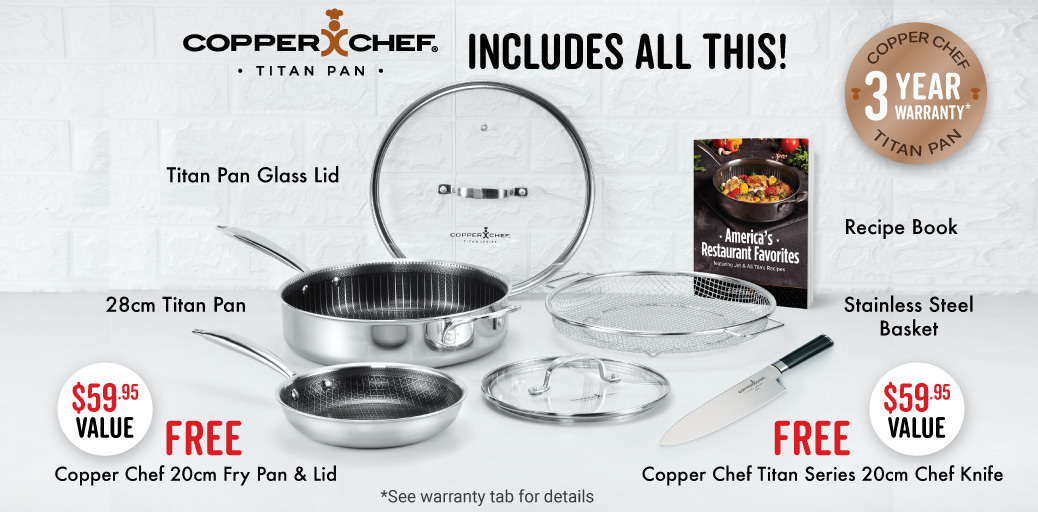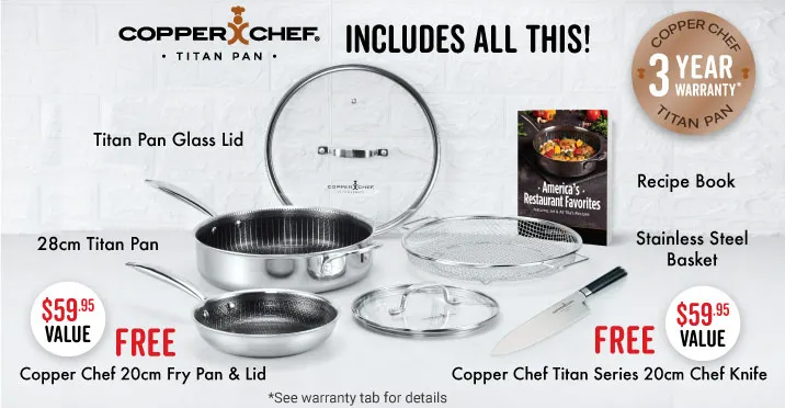 Copper Chef Titan 28cm Pan comes with a 3 year warranty. Global Shop Direct warrants this product is free of manufacturing defects. Should any such defect develop or become evident within 3 years from the date of purchase, Global Shop Direct will replace the entire product or, at its option, repair or replace the defective part(s) without charge. This warranty is void if damage or malfunction is due to abuse or failure to operate the product in accordance with the instructions.