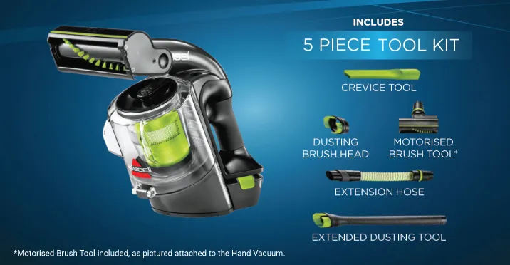 The Bissell® Multi Cordles Hand Vacuum comes with a 5 Piece Tool Kit that includes;