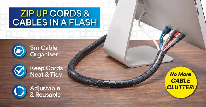- 3 metre cable organiser that zips up around multiple cords, transforming them into a single, tidy bundle