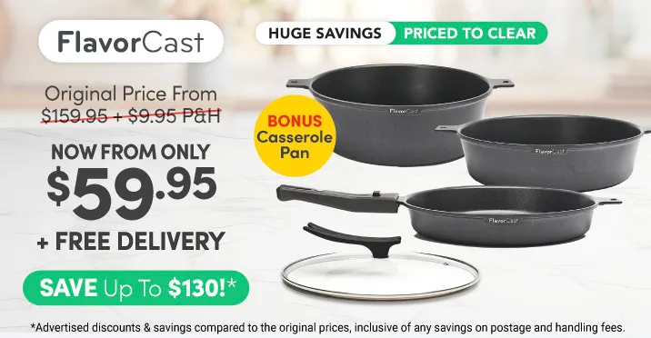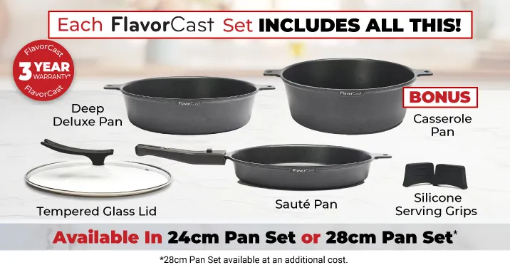 FlavourCast Pan sets are available in two sizes: 24cm and 28cm. Each set includes includes 1 x Deep Deluxe Pan, 1 x Sauté Pan, 1 x Removable Handle, 1 x Tempered Glass Lid and 1 x Pair of Silicone Serving Grips. Plus, as a special offer you will also receive a BONUS Casserole Pan.