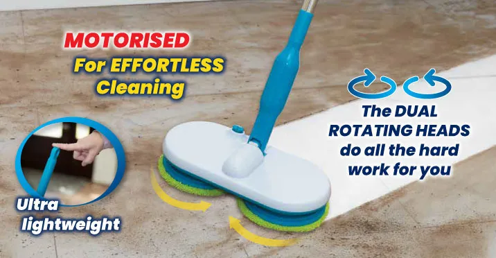 - Powerful, motorised spin mop that cleans away messes with ease