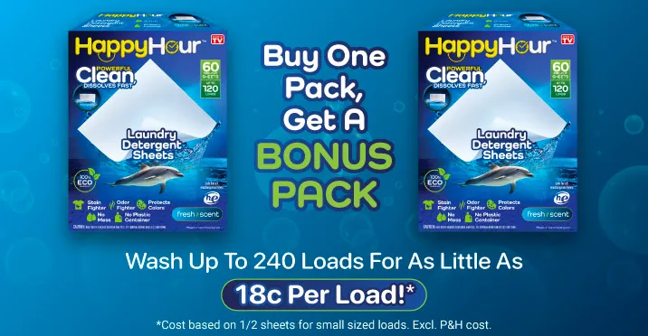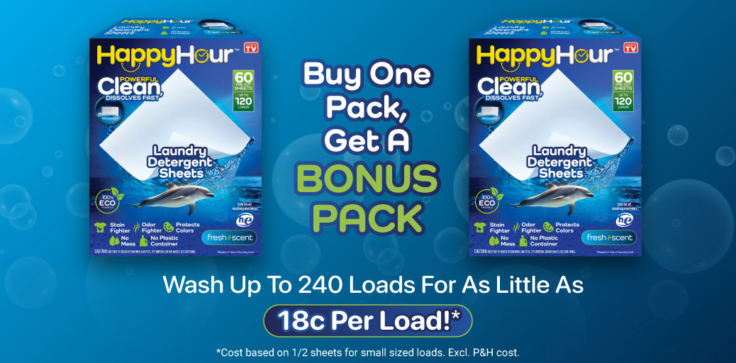And with the Bonus Pack offer, you’ll have 120 Happy Hour sheets, so you could wash up to 240 loads for as little as 21 cents per load*.