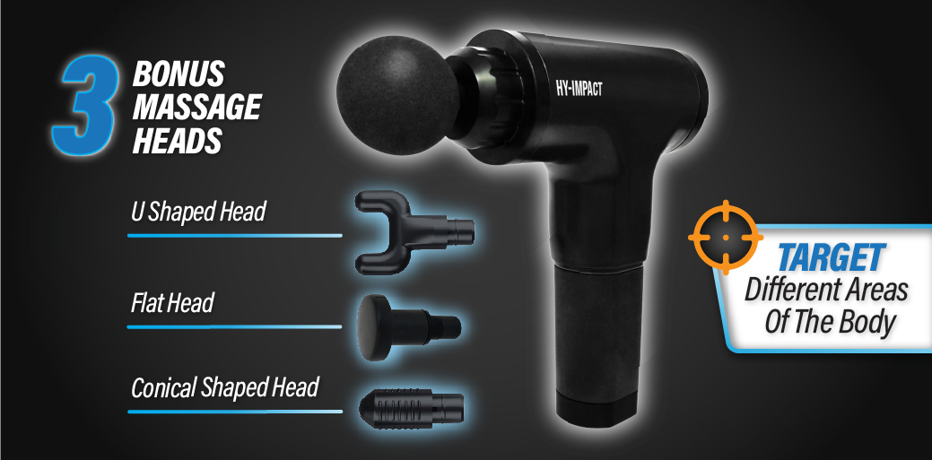 The Hy-Impact Cordless Muscle Massager comes with the Round Massage head plus 3 BONUS Massage heads including the Conical Shaped Head, the U shaped Head and the Flat Massage Head.