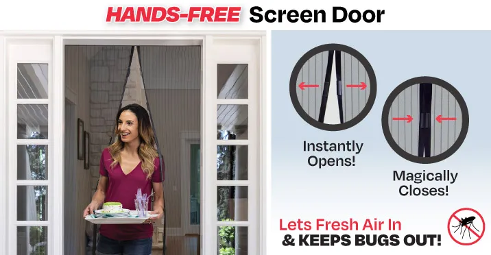 - Mesh screen door that allows you to walk through it easily, and then closes itself behind you using powerful magnets