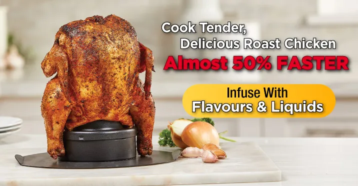 Yes, with the Miracle Chef Chicken Roaster you can cook a whole roast chicken to perfection. Just fill the flavour chamber with your favourite liquid, herbs or spices. Season your chicken and place it on the infusion cone. Then place on a baking sheet and pop it in the oven.