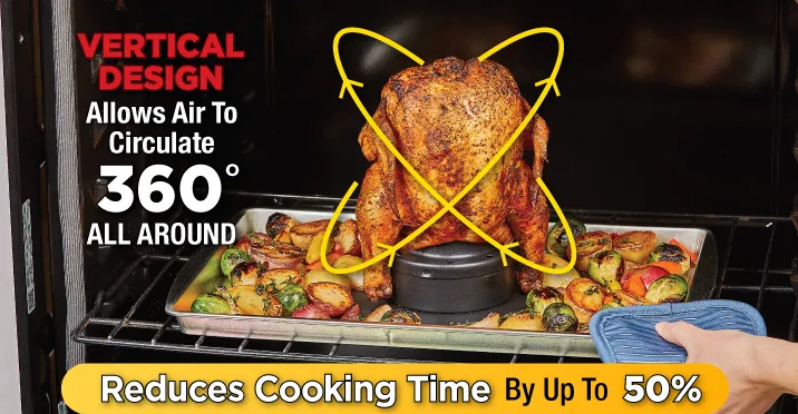 The Miracle Chef Chicken Roaster works by combining high oven heat that surrounds the chicken on the outside while super-heated steam from the infusion cone blasts chicken from the inside. The vertical design allows the chicken to be cooked from both directions for 360° of crispiness while also reducing cooking time by up to 50%.