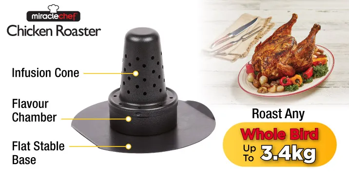 The Miracle Chef Chicken Roaster is strong enough to vertically roast up to a 3.4kg Chicken, when used as directed.