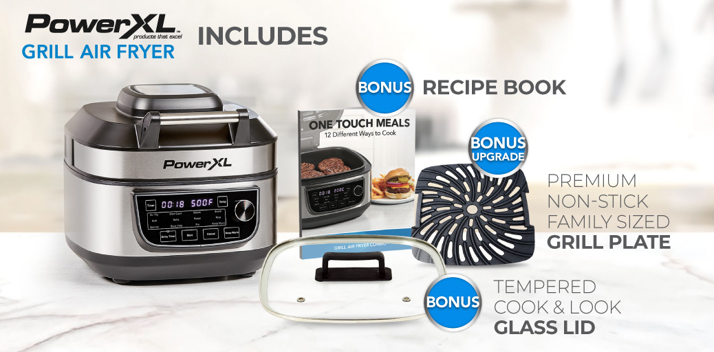 The PowerXL Grill Air Fryer includes the main unit with non-stick inner pot, air frying lid and serving ladle. You will also receive these 3 BONUSES: