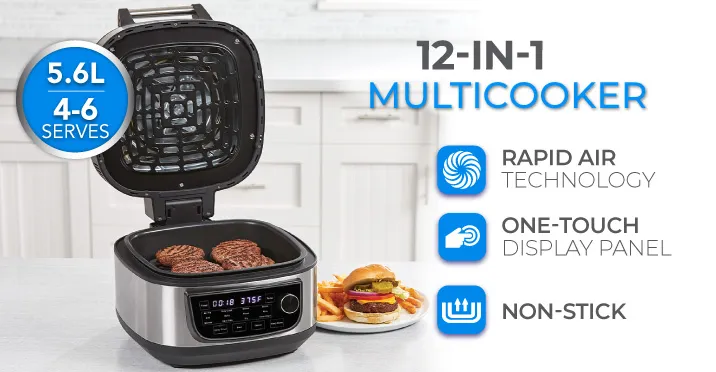 - 12-in-1 multi-cooker – air fry, slow cook, grill, steam, sauté, bake, roast, make rice, simmer, sous vide, fry, and keep warm