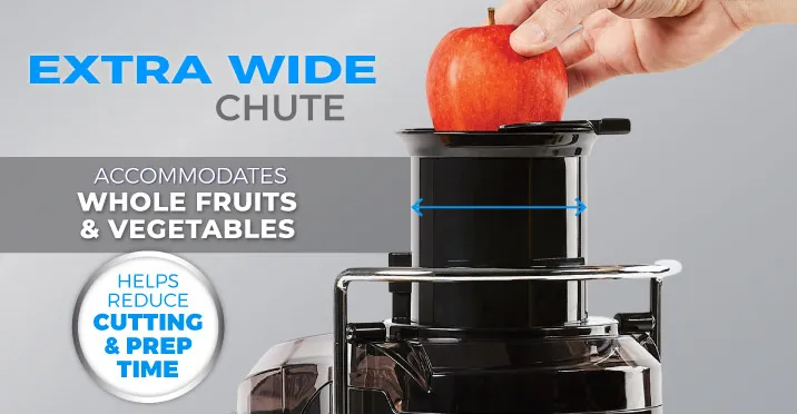 - Extra wide chute – expanded capacity accommodates most whole fruits and vegetables. Helps reduce cutting, chopping and prep time