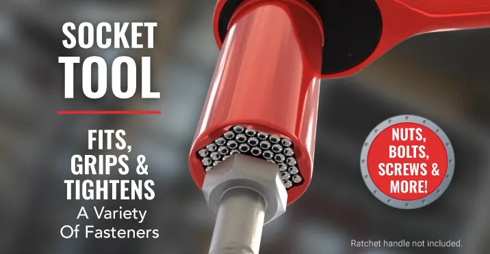 - Socket tool that fits, grips and tightens a variety of fasteners