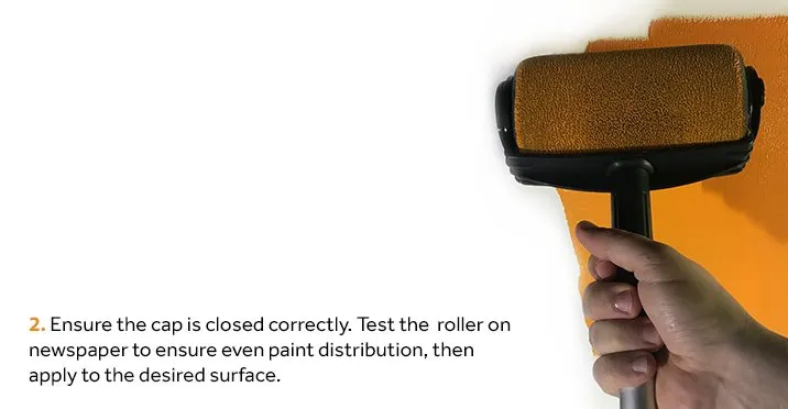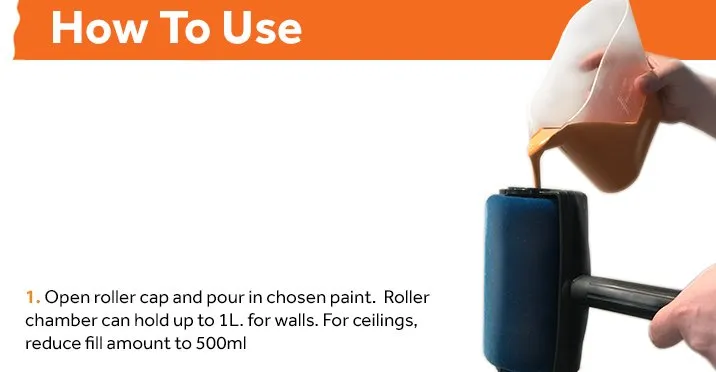 - Remove roller cap and fill roller with paint (up to 1L, reduce by half for ceiling)