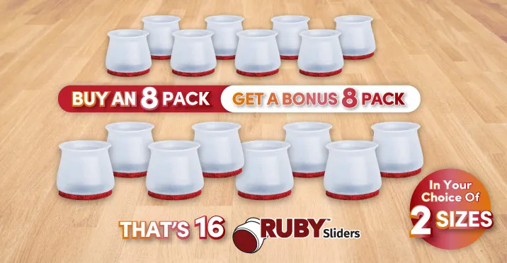 RUBY™ Sliders material is flexible and can be stretched and conformed to all different sized and shaped furniture legs. And with 2 sizes available, you can choose a size thats right for you. Choose RUBY™ Sliders Slim for skinny and narrow furniture legs. Or choose RUBY™ Sliders for fat, square and rectangular furniture legs.