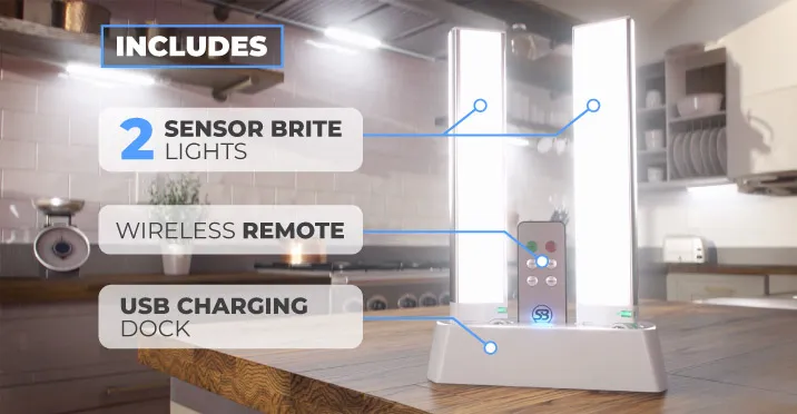 Sensor Brite Under Cabinet Lights include 2 x Sensor Brite Under Cabinet Lights, 1 x USB charging dock, 1 x remote, 4 x adhesive mounting brackets (2 per light) and a USB charging cable.