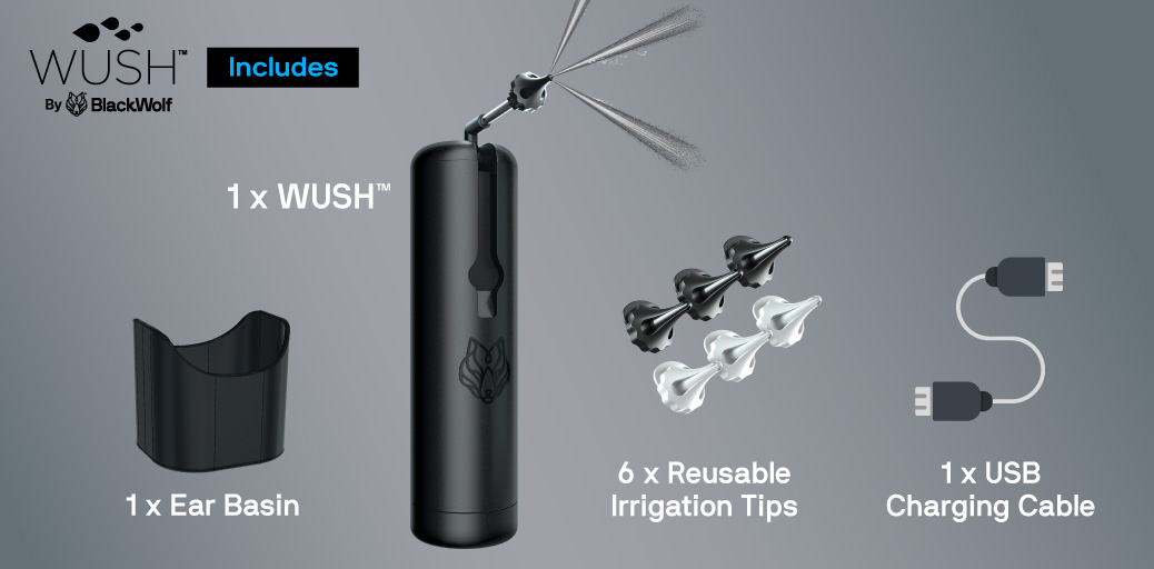 WUSH™ includes 1 x WUSH™ powered ear cleaner unit, 6 x Reusable Irrigation Tips, 1 x Ear Basin and 1 x USB Charging Cable.