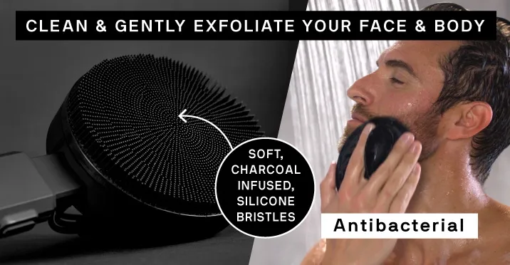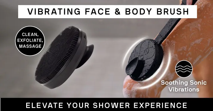 - Vibrating face and body brush that gently massages, deep cleans & exfoliates your skin while you shower