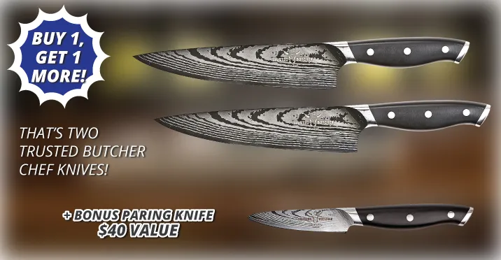 When you purchase the Trusted Butcher Chef Knife you will also receive a BONUS Trusted Butcher Chef Knife, PLUS a BONUS Paring Knife, and you can download the Trusted Butcher Recipe Book.