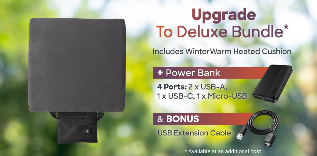 For the ultimate WinterWarm Heated Cushion experience, upgrade to the Deluxe Bundle, which includes a Portable Power Bank to power your Cushion and your other compatible devices on the go!