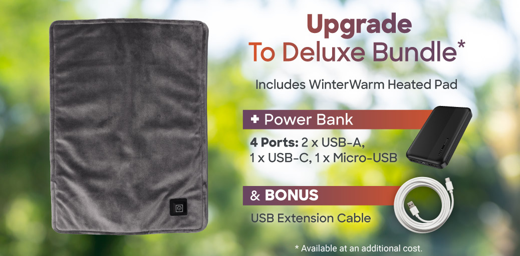 For the ultimate WinterWarm Heated Pad experience, upgrade to the Deluxe Bundle, which includes a portable power bank to power your Pad and your other compatible devices on the go.