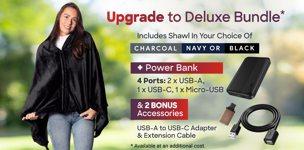 For the ultimate WinterWarm Heated Shawl experience, upgrade to the Deluxe Bundle, which includes a Portable Power Bank to power your Shawl and your other compatible devices on the go!